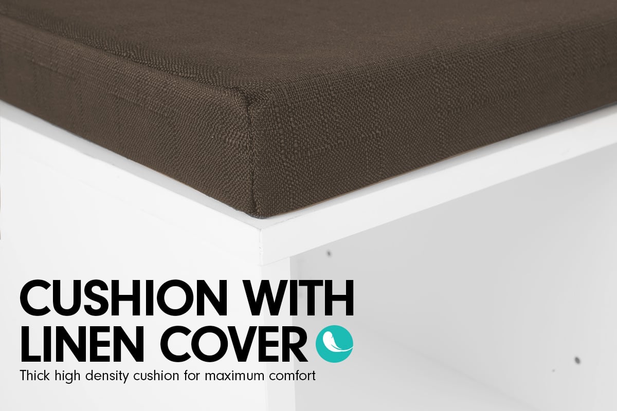 Made from durable and sturdy MDF material with a sleek Melamine finish, this shoe cabinet is easy to install and clean. The cushioned bench has a weight capacity of 120kg and a thickness of 50mm, making it both comfortable and practical. The cushion is also detachable with a zipper for easy cleaning.