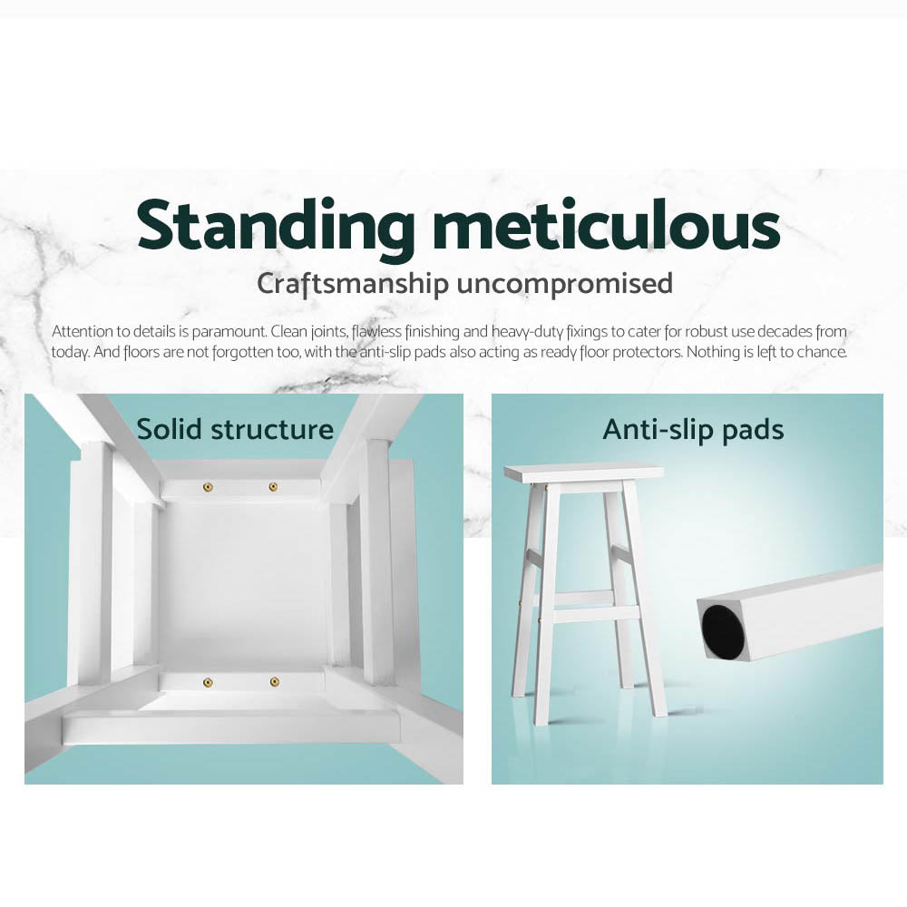 Introducing the Artiss Set of 2 Wooden Backless Bar Stools in White - the perfect addition to your home décor. These bar stools are not only strong and tough, but also sturdy in every way. Whether you place them at the kitchen island, breakfast corner, or bar counter, they fit nicely under the counter at just the right height. The split-level footrests provide a good foot rest for both teens and adults, while also ensuring a well-supported A-frame that won't give way easily. The sturdy seat offers comfortable seating, and the anti-slip floor protectors keep the bar stools firmly in place even with robust use.