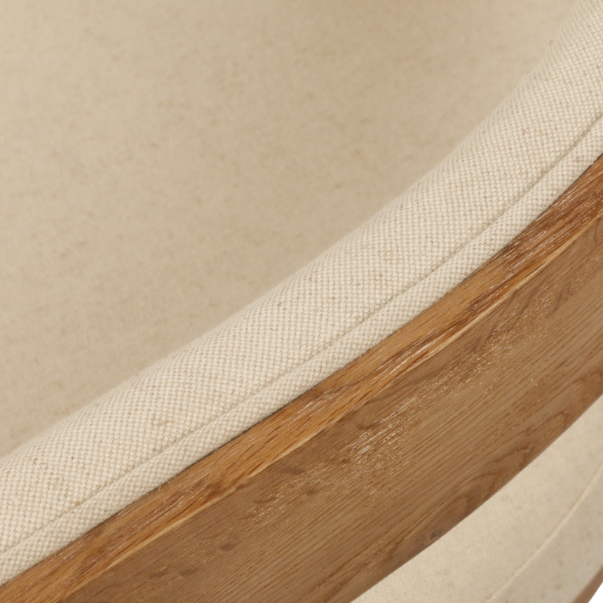 Seat and backrest upholstered in 60% Linen & 40% Cotton Fabric is in a light beige finish Barrel back tripod frame made of natural solid oak wood Crisp angles and curving contours 100% Foam filling for soft medium firmness 3× thick flat legs upholding the arched contour Suitable for commercial use 120kg weight capacity Product is fully assembled