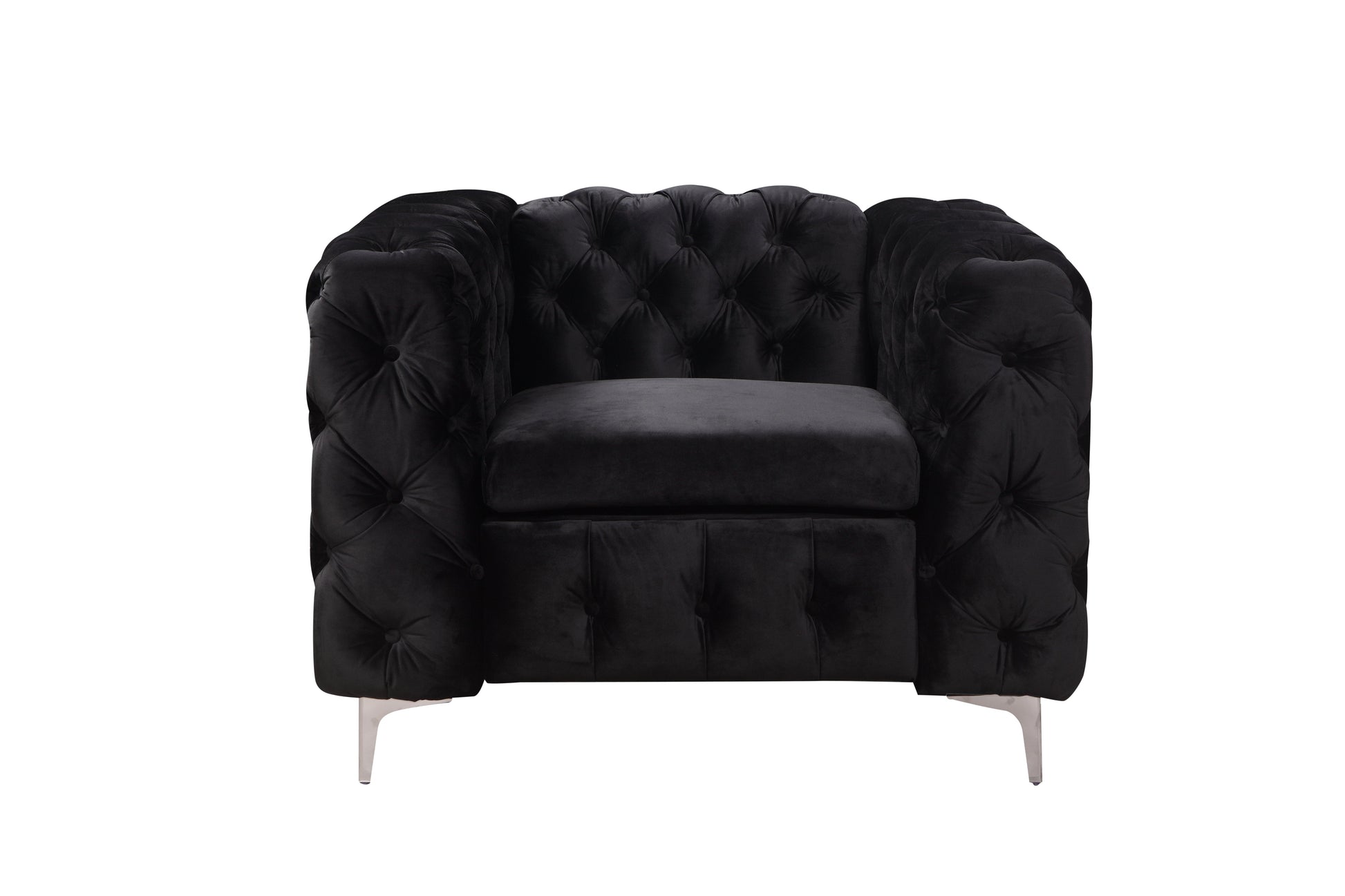 Single Seater Black Sofa Classic Armchair Button Tufted in Velvet Fabric with Metal Legs