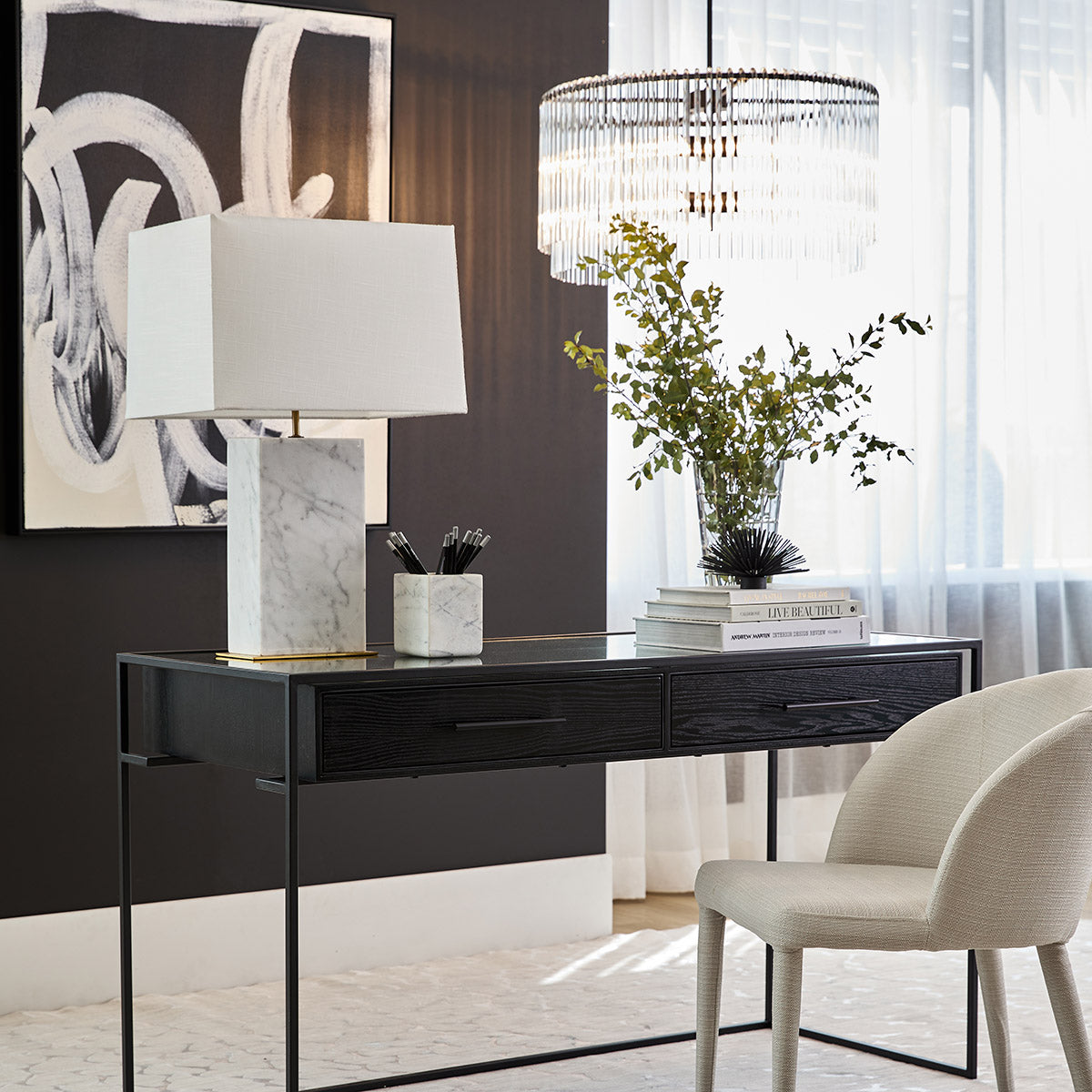 The Art Deco style born in 1920s is evident in the delicate elegance of our Zara Pendant collection. Hand-made crystal rods drape effortlessly over a powder coated black frame, hanging in modest harmony. The Zara pendant exudes exceptional class, providing a dramatic play of light and softly diffused glow.